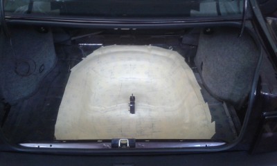Ich bin noch bei der Fertigstellung, aber wollte hier zwei Bilder meiner Loesung fuer die Reserveradmulde zeigen. Ich habe 2 19mm MDF Platten verklebt/verschraubt, der Sub ist in der oberen Platte eingelassen und liegt auf der unteren Platte auf. Abgedichtet wird durch einen Filzstreifen, die Platte wird im geschlossenen Zustand durch 10 Schrauben M5 fest im Bodenblech fixiert. Zum Aufmachen ist vorne ein Scharnier angebracht und eine Gasdruckfeder haelt die Klappe offen. Erste Versuche zeigen dass der Bass super-knackig ist. Der Innenraum der Mulde liegt im Volumen zwischen den Empfehlungen fuer eine geschlossene und eine Bassreflexkiste, ich werde noch mit einem (kleinen) verstellbaren Reflexrohr experimentieren um noch tiefere Frequenzen rauszukitzeln.