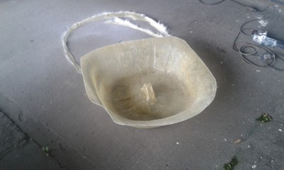 zuerst Kreppband, dann da drauf Paketklebeband und das GFK. Wenns trocken ist, ausformen und zuschneiden. Zum Schluß den Deckel drauf.