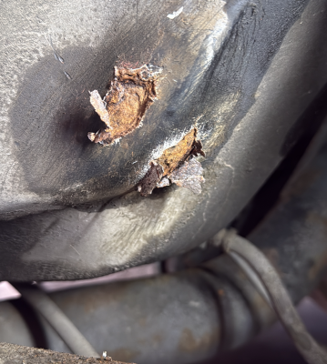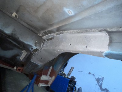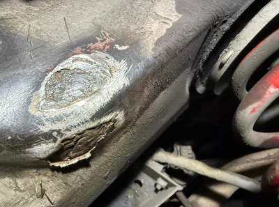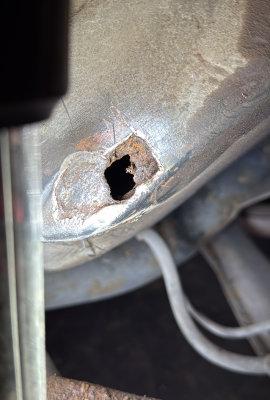war gerade dabei die Schweller abzunehmen, da ich zum Lackierer wollte, kleinere Schönheits-OP an den Schwellern machen. Dabei ist mir auf der Bühne am Rahmen Hinten ein erst kleiner Rostfleck am Rahmen aufgefallen, ich habe angefangen den zu öffnen und abzuschleifen (Topfbürste) um zu schauen, ob der durch geht.